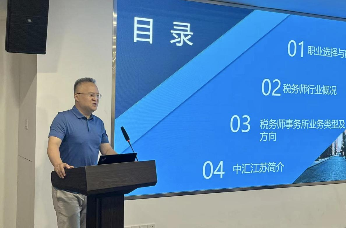 郑伟总经理站在企业人才需求角度,为同学们作了题为职业选择和能力培养的报告。郑总经理指出,在能力培养中同学们要注重理论知识学习、加强知识领悟,能够理论联系实际,将自己所学理论知识运用到实际工作中去。在职业选择中,郑总经理希望同学们坚守初心,可以选择继续深造进行理论研究,也可以投身实践做好本职工作。随后,郑总经理结合自己多年工作经验,从税务师事务所特点、行业前景、营业情况、业务结构、发展方向等方面向同学们介绍了税务师行业,并祝愿同学们学习进步,工作顺利。