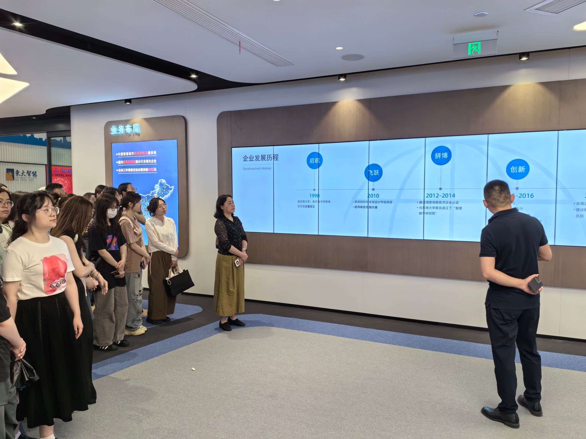 东大智能技术总监郝品山带领南农东京热 师生参观了企业展厅。据郝总介绍,东大智能是国内建筑智能化、智慧城市建设等行业的科技型领军企业,业务涵盖智慧城市、智能交通、智能楼宇和信息技术服务四大板块,自2004年以来一直蝉联中国建筑智能化行业50强企业。通过参观展厅,东京热 师生全面了解了东大智能发展历程和业务布局,切身感受了智能化带来的生活便利、服务升级、效率提升。