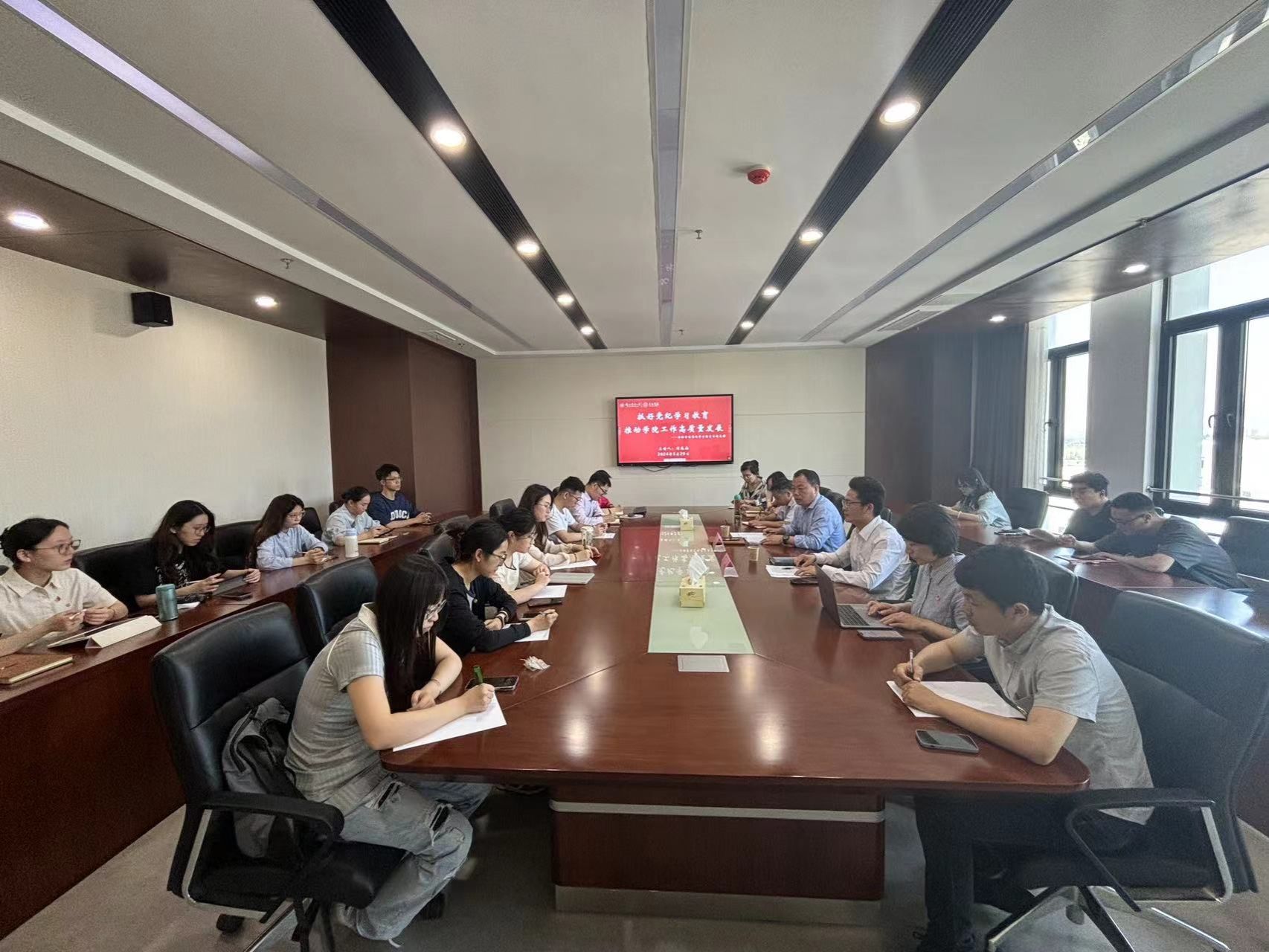 5月29日上午,东京热 党委在第三实验楼1202会议室开展《抓好党纪学习教育,推动学院工作高质量发展》主题教育专题党课。本次党课由学院党委书记刘兆磊主讲,党委副书记朱珠主持,学院全体党支部书记和支委参加。