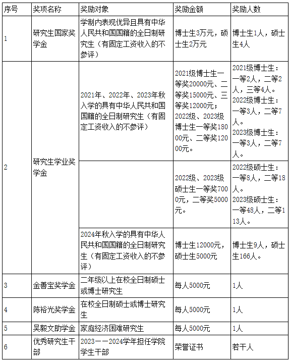 各类研究生奖学金参评对象、奖励金额及奖励人数见下表: