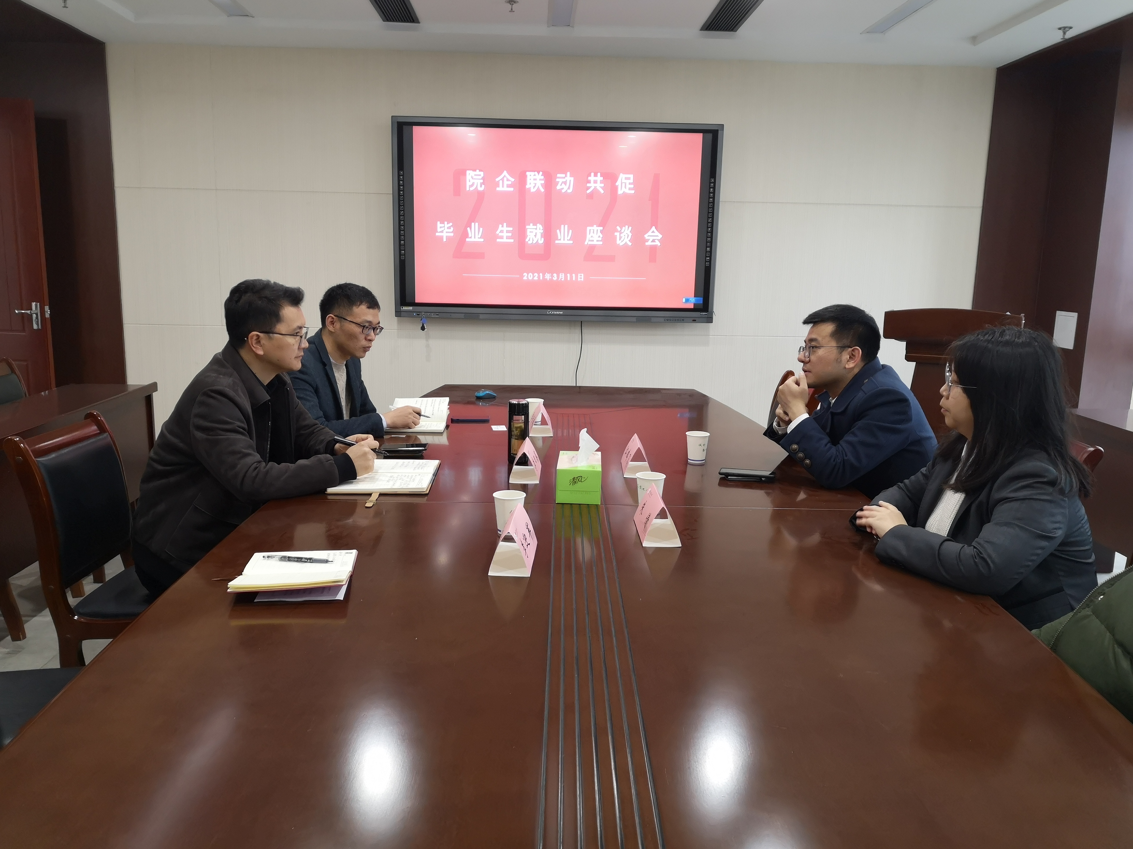 近日,东京热 与兴业证券南京分公司、东北证券南京分公司就共促毕业生就业工作开展座谈交流。兴业证券南京分公司总经理江鹏飞、人力相关负责人朱倩,东北证券南京分公司副总经理刘华、财富总监韩天娇等到访东京热 ,东京热 党委副书记李日葵、东京热 辅导员陆佳俊、李迎军参加座谈。