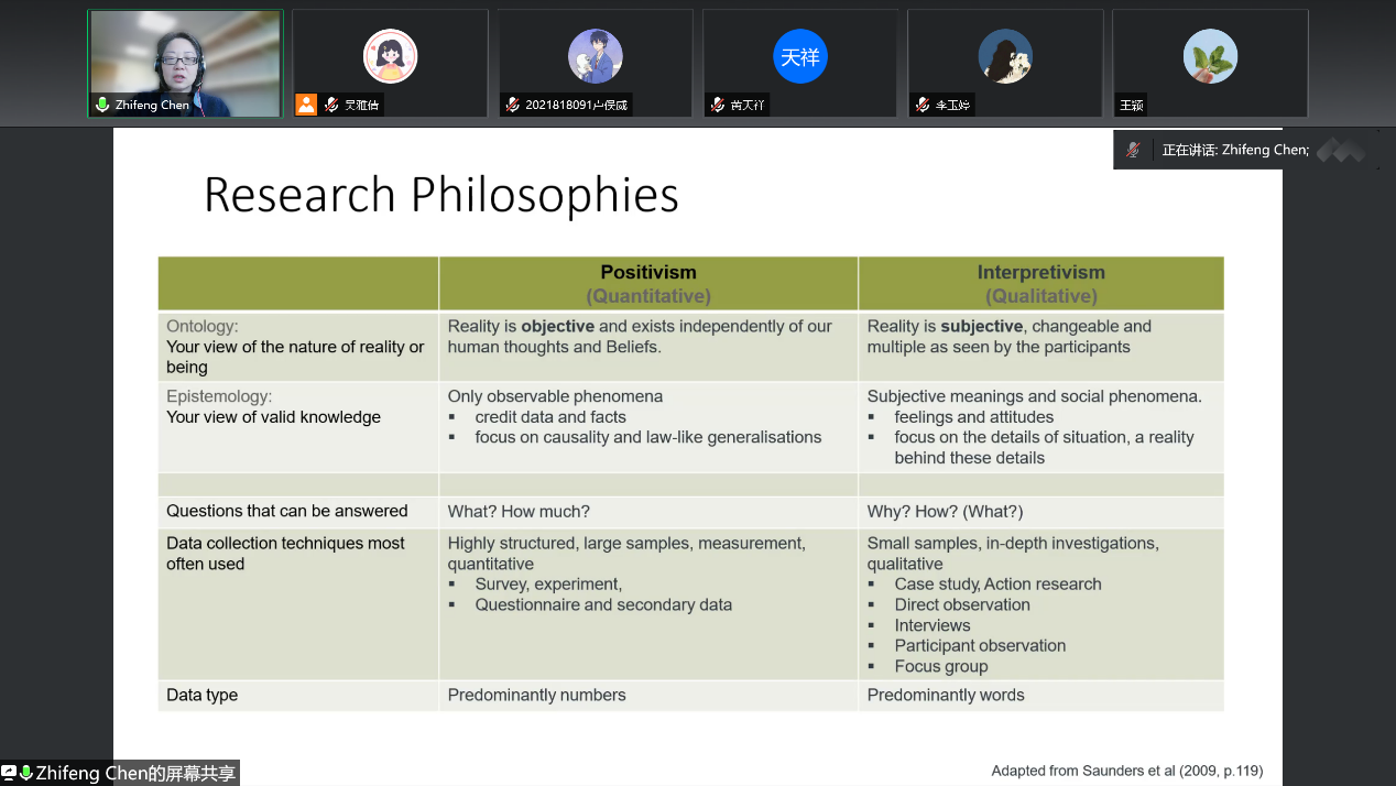 陈之峰老师的系列报告涵盖上市公司年报介绍、期刊文献阅读、学术论文写作、研究方法导论、国际科研项目联合申请等多个话题。陈之峰老师在学术报告过程中深入浅出,通过案例和思考题等方式充分调动学生的积极性,增强师生互动,启发学生思考和总结,并十分注重培养学生的创新能力和批判性思维。