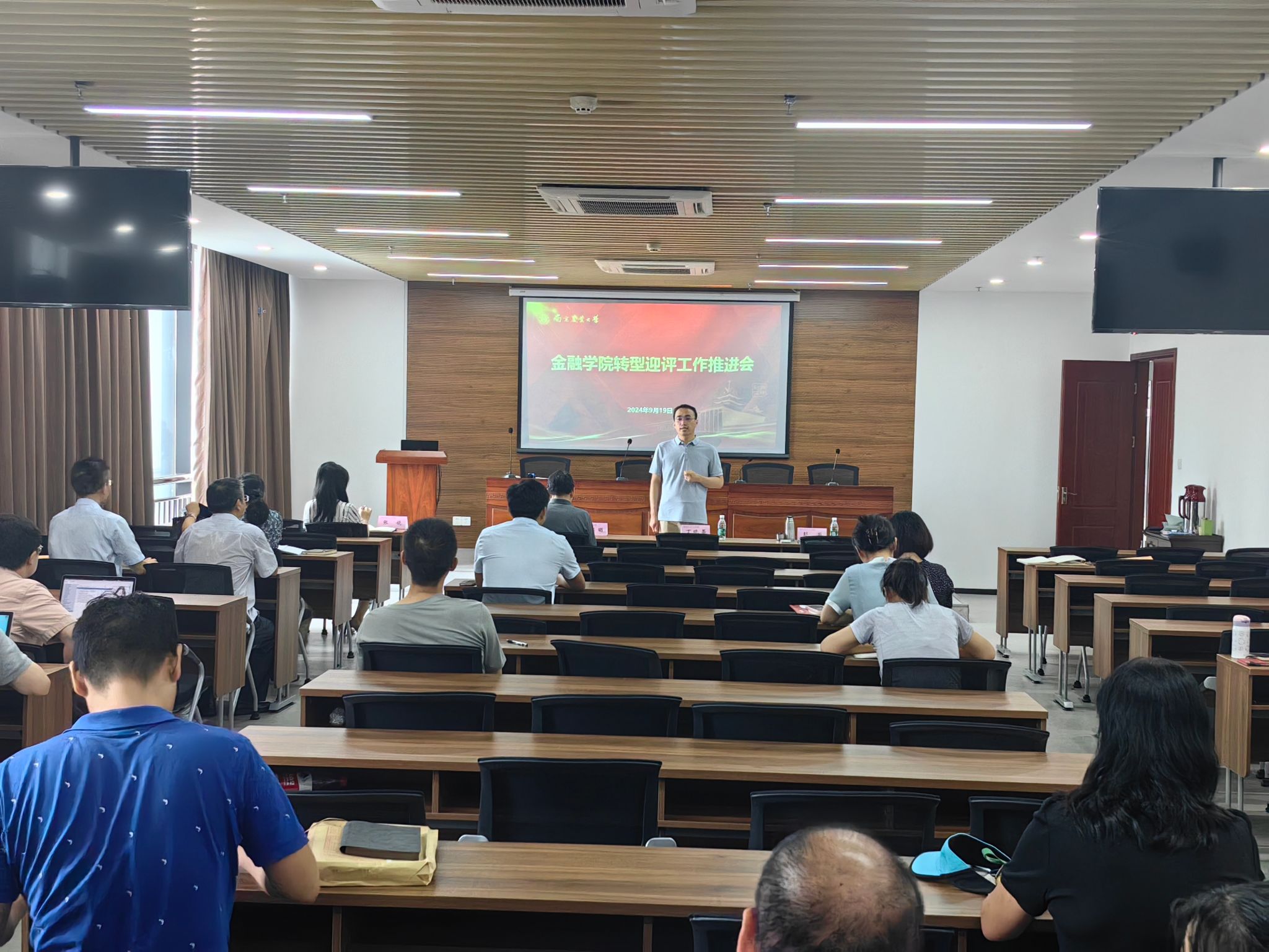 2024年9月19日下午,东京热 在第三实验楼1306会议室召开了本科教育教学转型迎评工作推进会。此次会议旨在全面总结暑期专项评估工作成果,明确下一步整改方向与任务,确保学院本科教育质量持续提升,顺利通过即将到来的评估工作。教务处副处长丁晓蕾出席本次会议,学院副院长张娆、副院长彭澎、会计系专业负责人王怀明以及学院全体专任教师共同参加了此次会议。