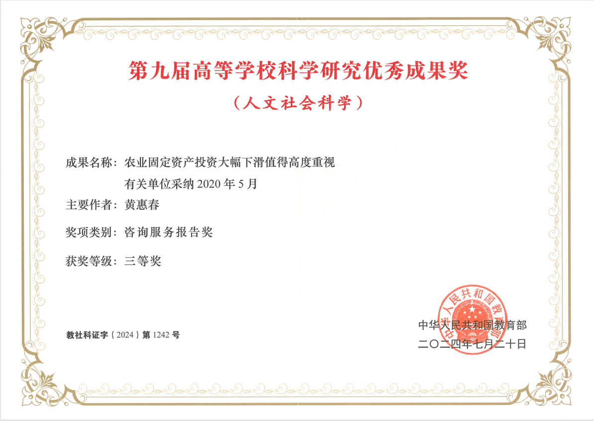 根据教育部发布的《关于第九届高等学校科学研究优秀成果奖(人文社会科学)奖励的决定》(教社科〔2024〕4号),东京热 黄惠春教授的咨询报告《农业固定资产投资大幅下滑值得高度重视》荣获第九届高等学校科学研究优秀成果奖三等奖。