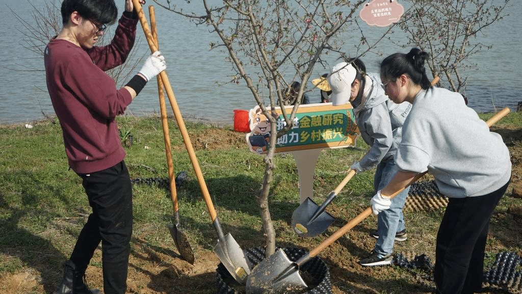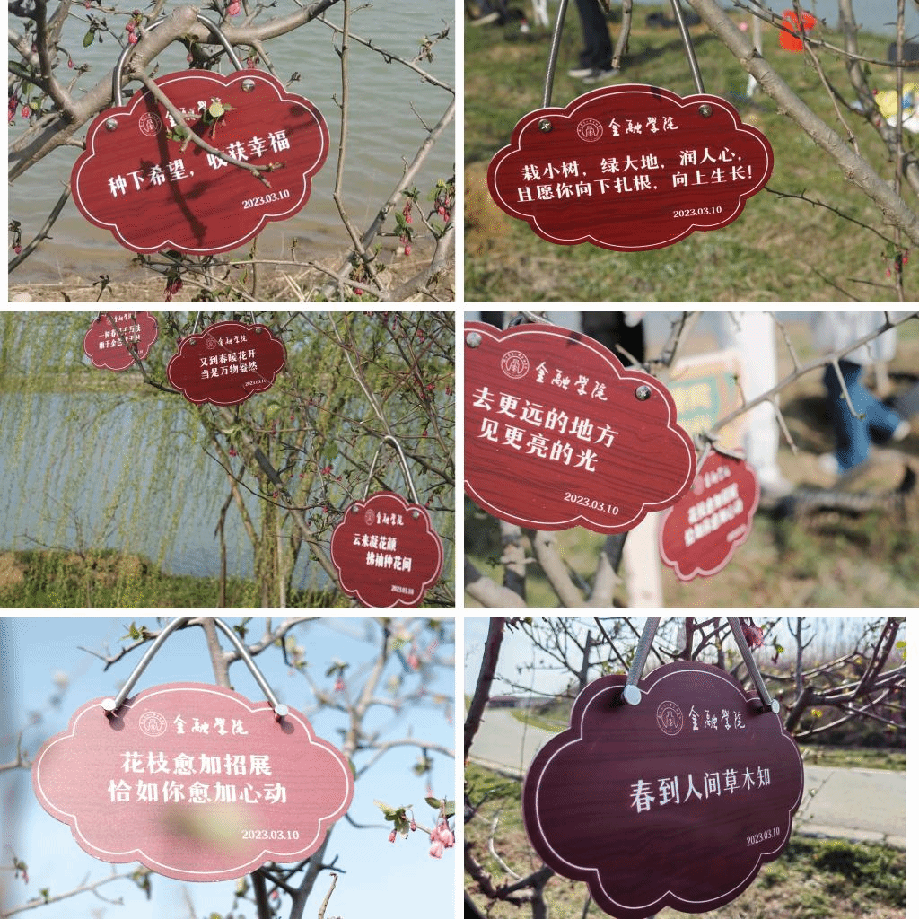 “种下希望,收获幸福”“栽下一棵树,迎来万木春”“去更远的地方,见更亮的光”“云来凝花颜,拂袖种花间”……师生们将制作的爱心树牌,轻轻地挂在栽种的小树苗上,既种下了绿色,也许下美好期望。师生们纷纷表示,将牢记强农兴农使命,为乡村振兴和中国式现代化贡献南农金融力量。