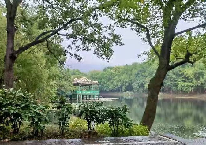 秋色宜人,穿行在山林中,让人心旷神怡。不知不觉我们经过南京地震科学馆、到达流徽榭。此时的水榭碧水如镜、树木青翠欲滴、周围绿草茵茵,别有情趣。