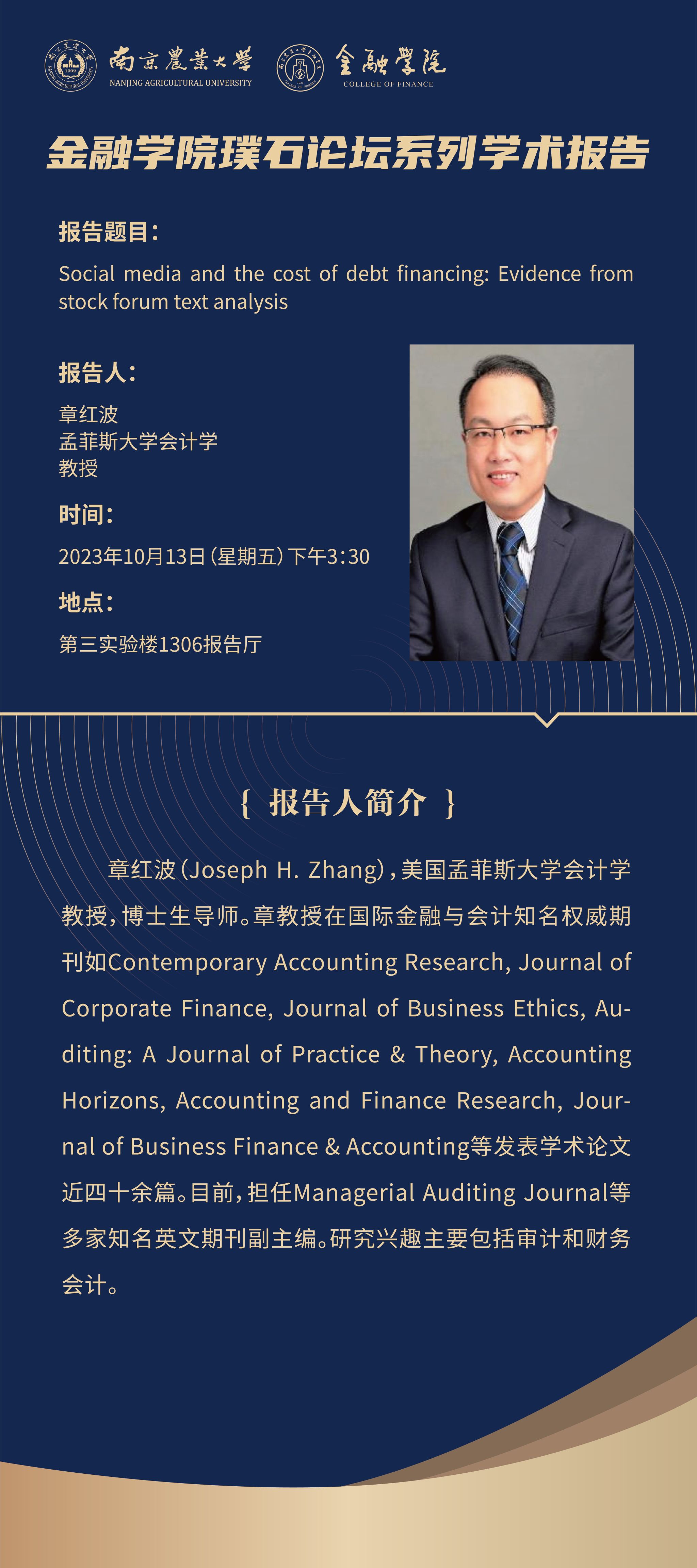 讲座预告(10.13)丨美国孟菲斯大学章红波教授讲座通知