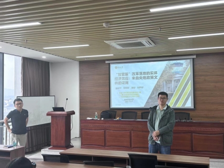 潘老师首先引出“放管服”改革政策落实慢,推进过程有阻力这一现象,现象与理论背离的可能原因在于层级政府间的央地代理问题,从而得出研究的问题:由层级政府间的央地代理问题引发的“放管服”改革执行力差异如何影响微观企业的投资决策?随后,他展示了本文的主要发现以及研究贡献。接着,他从“放管服”改革落地慢的成因以及“放管服”改革执行力如何影响企业实体投资这两方面进行了理论分析和研究假设,采用文本分析法将中央政府的“放管服”改革文件与地方政府的政策文件进行匹配,将文件发布到地方落实的天数作为“放管服”改革执行力的度量指标并进行样本选取和模型搭建。除控制内生性问题外,本文还进行了机制检验、分组研究、拓展性检验和稳健型检验。最后,他得出结论,在“放管服”改革执行力越强的地区,企业的实体投资越活跃;交易成本机制破除了地方官员自行设立的审批事项,破除了头部企业通过游说政府所设立的各种经营障碍;地方政府推动“放管服”改革的动力来自于通过服务企业来获得税收收入而非中央政府的转移支付;企业的金融化水平显著下降,企业的金融资产获利占比显著下降。