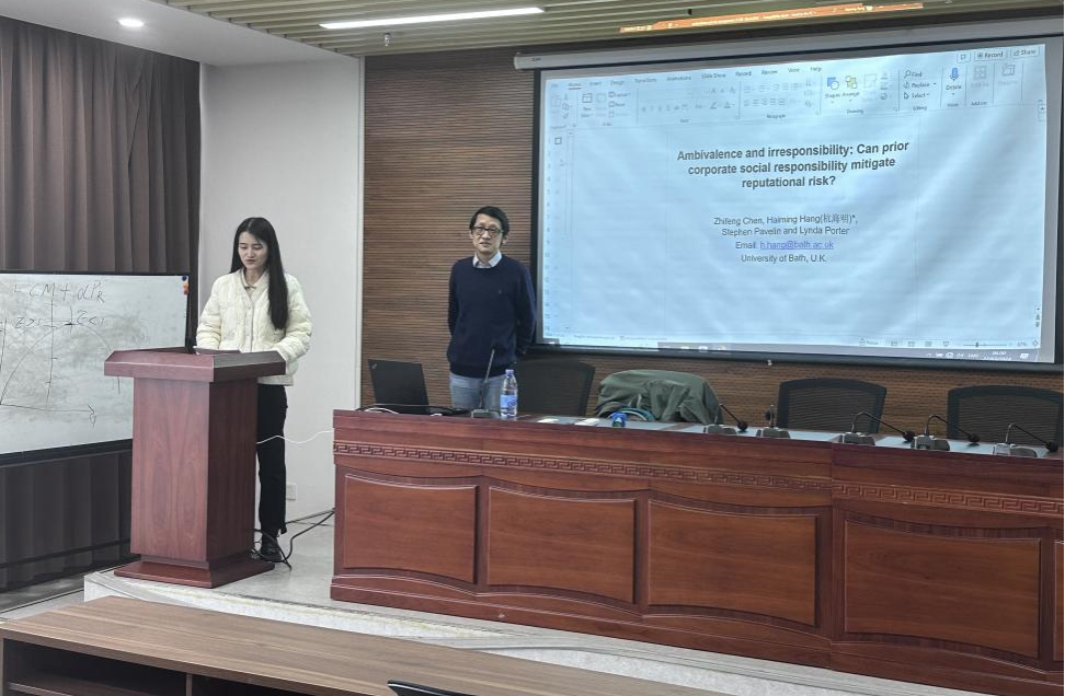 吴雅倩对杭海明教授受邀开展学术报告表示热烈欢迎。杭海明现为英国巴斯大学市场营销系教授,博士生导师,市场营销系主任,具有丰富的教学经验,主要研究方向为社会企业责任、社交媒体和人工智能。