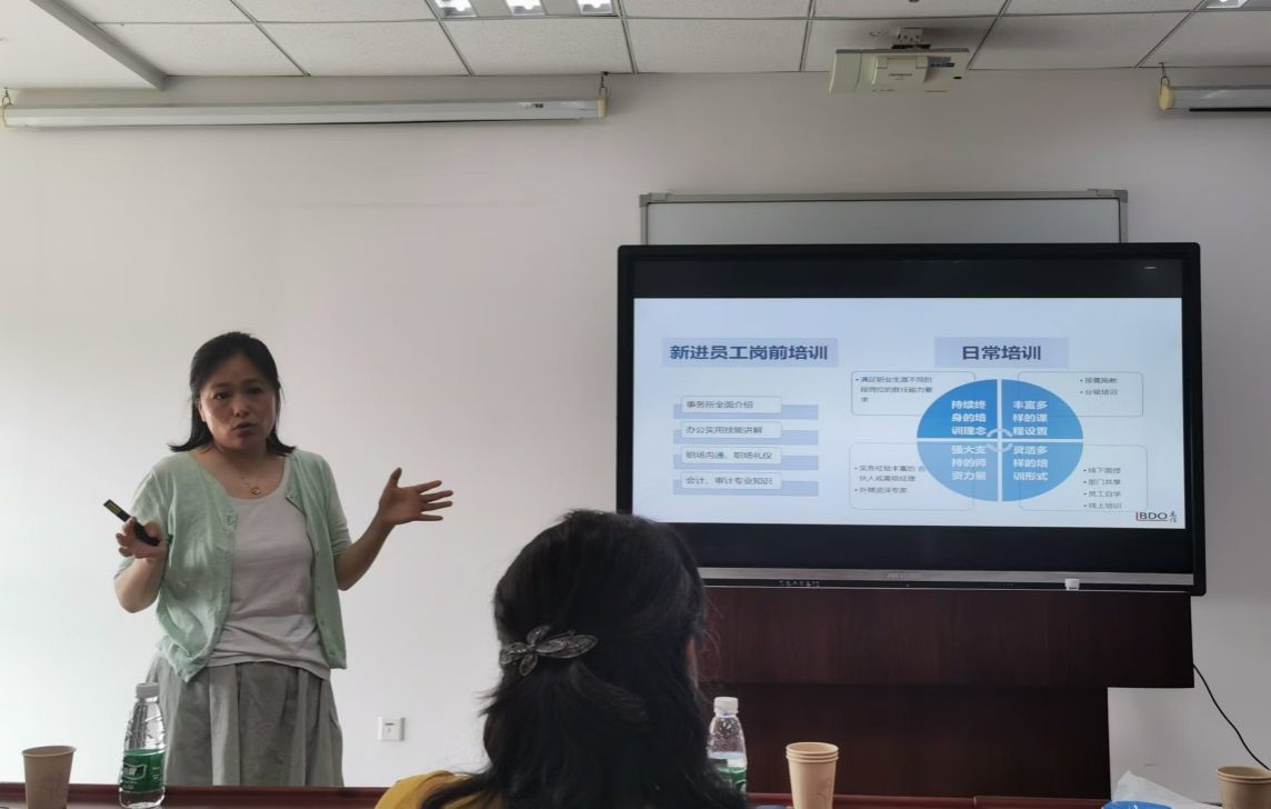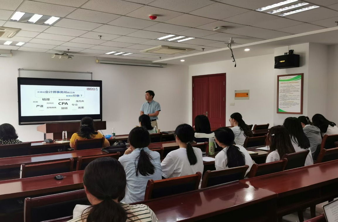 冯经理介绍了立信会计师事务所江苏分所的发展历史、国内领先的行业地位、丰富的客户资源、多层次的业务范围、辉煌的业绩以及成功的校企合作,详细介绍了立信完备的培训体系与公平开放的晋升通道。