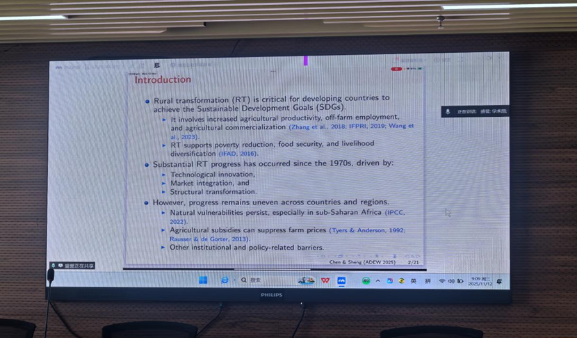在报告阶段,盛誉教授围绕农村转型过程中农业劳动生产率的核心决定因素展开系统阐述。他基于涵盖172个发展中国家、时间跨度达52年(1970–2021)的综合面板数据,运用条件分位数回归(CQR)模型结合半参数方法,深入分析了制度安排、政策干预与公共投资在不同转型阶段对农业劳动生产率的影响。盛 誉 教授指出,农村转型早期阶段受历史制度因素主导,而随着转型深入,公共投资的作用日益凸显。研究还揭示了区域差异:非洲受历史制度影响显著,亚洲与拉丁美洲则更多依赖灌溉等公共基础设施。此外,牧业体系面临公共投资不足与市场扭曲的双重制约。该研究为发展中国家在不同转型阶段制定差异化政策提供了理论依据与实践参考。