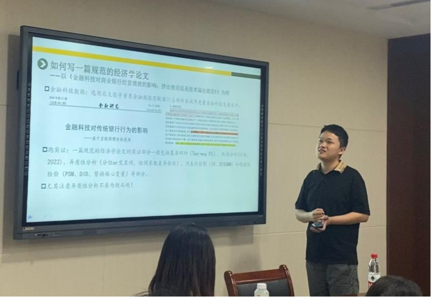 熊健作主题为《读博的几点建议和分享》的专题分享会。他针对硕士生和博士生从如何找到选题灵感,如何写一篇规范的经济学论文,论文投稿、返修和发表,高效科研工具和科研建议,找工作的几点经验五个方面进行干货分享,为大家提供了宝贵经验。他具体结合了博士期间的研究成果,以轻松幽默的方式细致地为大家示范如何找到选题灵感和写一篇规范的经济学论文,助力同学们在发表论文的过程中少走弯路。熊健强调:科研工作需要多动笔,多与导师、同门交流,多参加学术会议,扩大信息面,真正做到从善如流。在此次学术分享会中,支部成员认真聆听,并且根据自身在学习方面存在的困惑向熊健博士进行了请教。